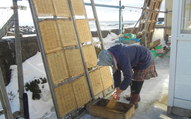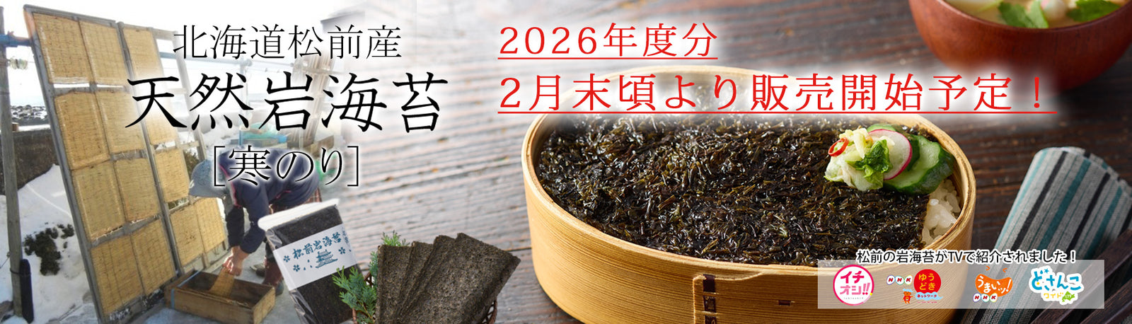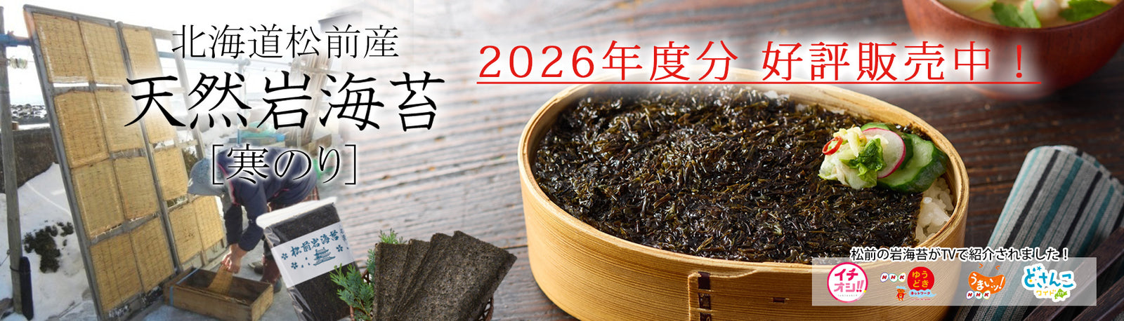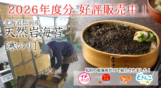 続きはこちら年間で1000~1500帖(1帖は10枚)しか入荷されない、地元以外ではほぼ流通していないという幻の海苔。色の黒さ、風味の良さ、香りの強さが特徴で、「松前の岩海苔は格が違う」と昔から海産物問屋の中では有名なのが松前産天然岩海苔です。